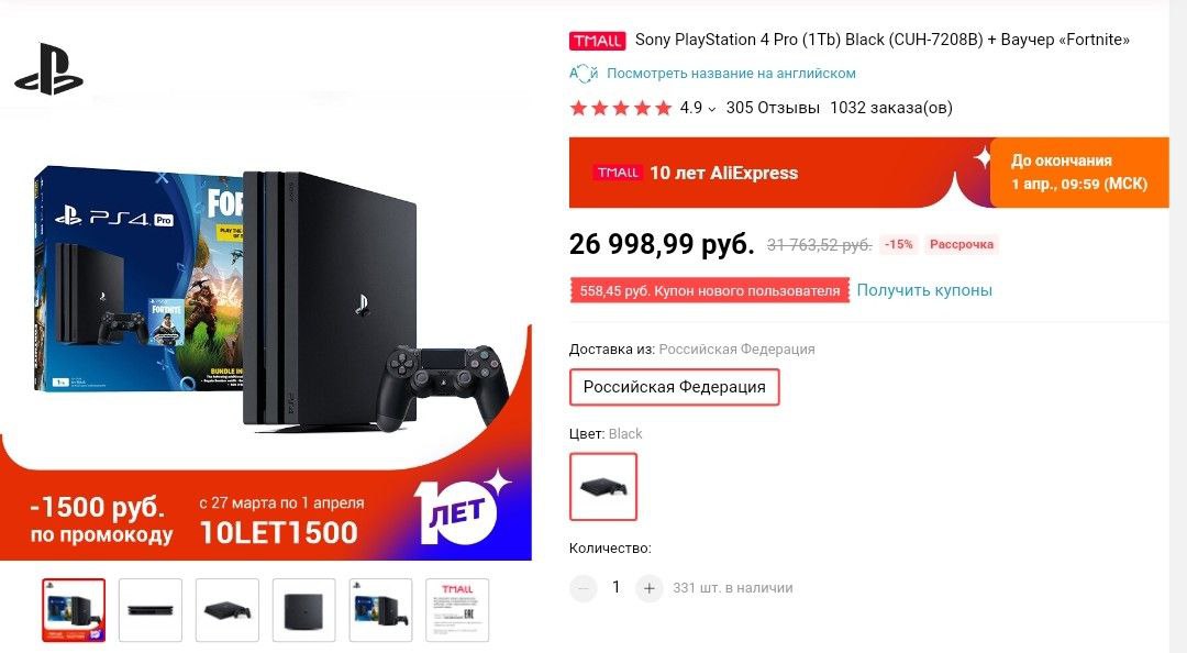 AliExpress Tmall - PlayStation 4 Pro 1Tb за 24498₽ и PS4 Slim 1 Tb за 20030₽!Очень выгодное предложение для тех, кто собирался покупать эту игровую консоль.