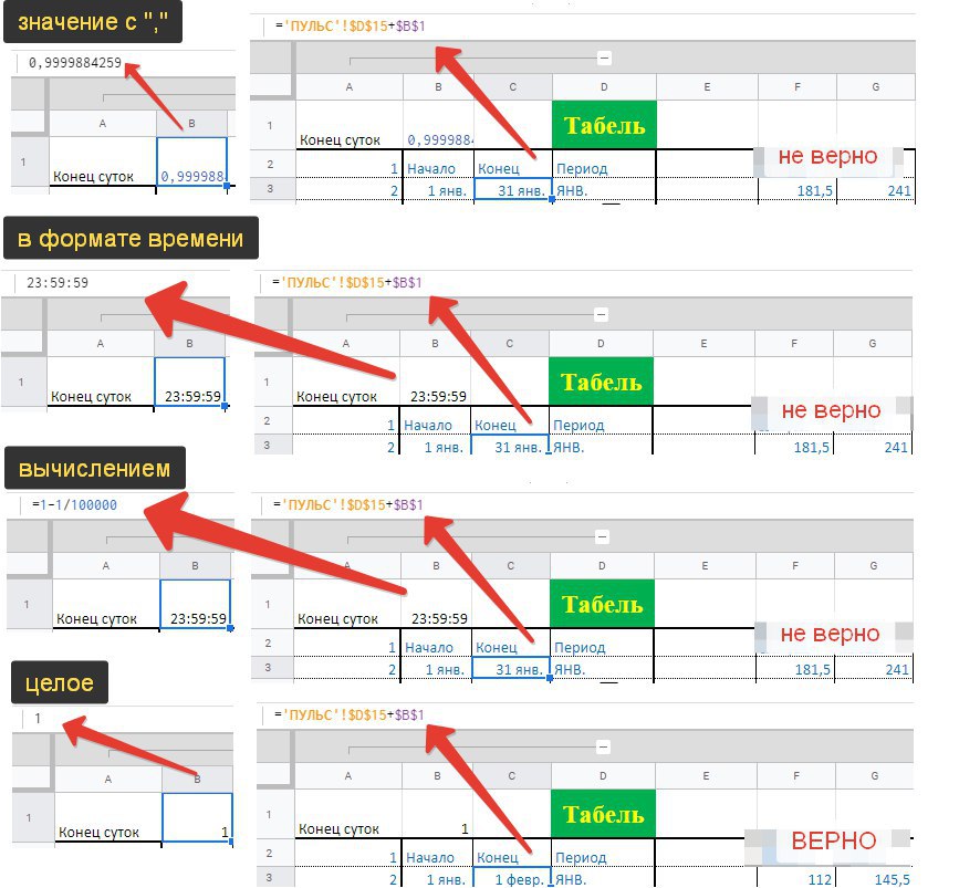 у меня есть дата конца периода 31 января 2019 в опред. ячейке, но мне нужно чтобы этот день тоже брался в учет, т.е. 31 января 2019 23:59:59, потому я прибавляю время конца суток (23:59:59, что равно 0,9999884259). Раньше все работало) а теперь пошла МАГИЯ гугл)
