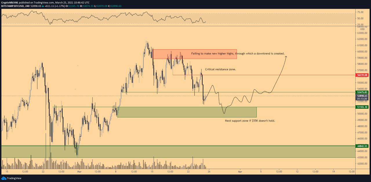 После того как Илон Маск объявил о начале продажи электромобилей Tesla за биткоины, цена начала рости, однако не смогла преодолеть критическое сопротивление на уровне $56,5 тыс. Это сделало неизбежным новый тест поддержки на уровне $53 тыс.