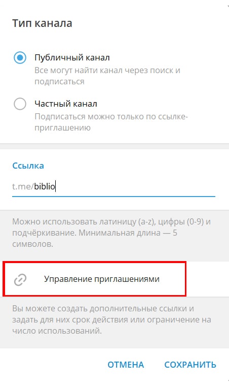 • Администраторы могут управлять ссылками из профиля группы или канала: «Изменить» > «Пригласительные ссылки».