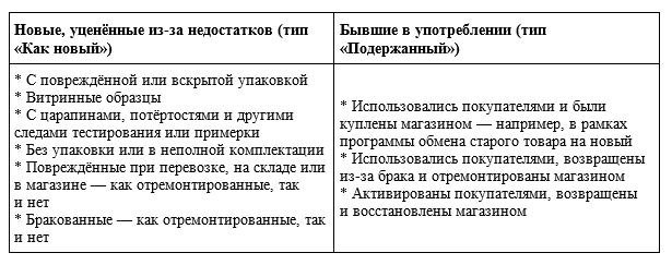 Это могут быть товары двух типов: бывшие в употреблении и новые, но уценённые из-за недостатков. В прайс-листе их нужно чётко различать: по требованиям законодательства, покупатели должны понимать, был товар в употреблении или нет. Вот примеры того, какие товары относятся к каждому из этих типов (см. изображение).