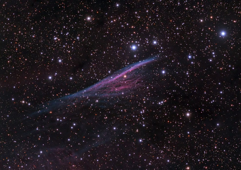 Туманность Карандаш (NGC 2736), часть оболочки сверхновой из созвездия Парусов. Фактически, туманность представляет собой ударную волну, распространяющуюся в космосе со скоростью полмиллиона километров в час (на снимке она летит снизу вверх). Несколько тысяч лет назад эта скорость была еще выше, однако давление окружающего межзвездного газа, каким бы ничтожным оно ни было, замедлило разлетающуюся оболочку сверхновой.
