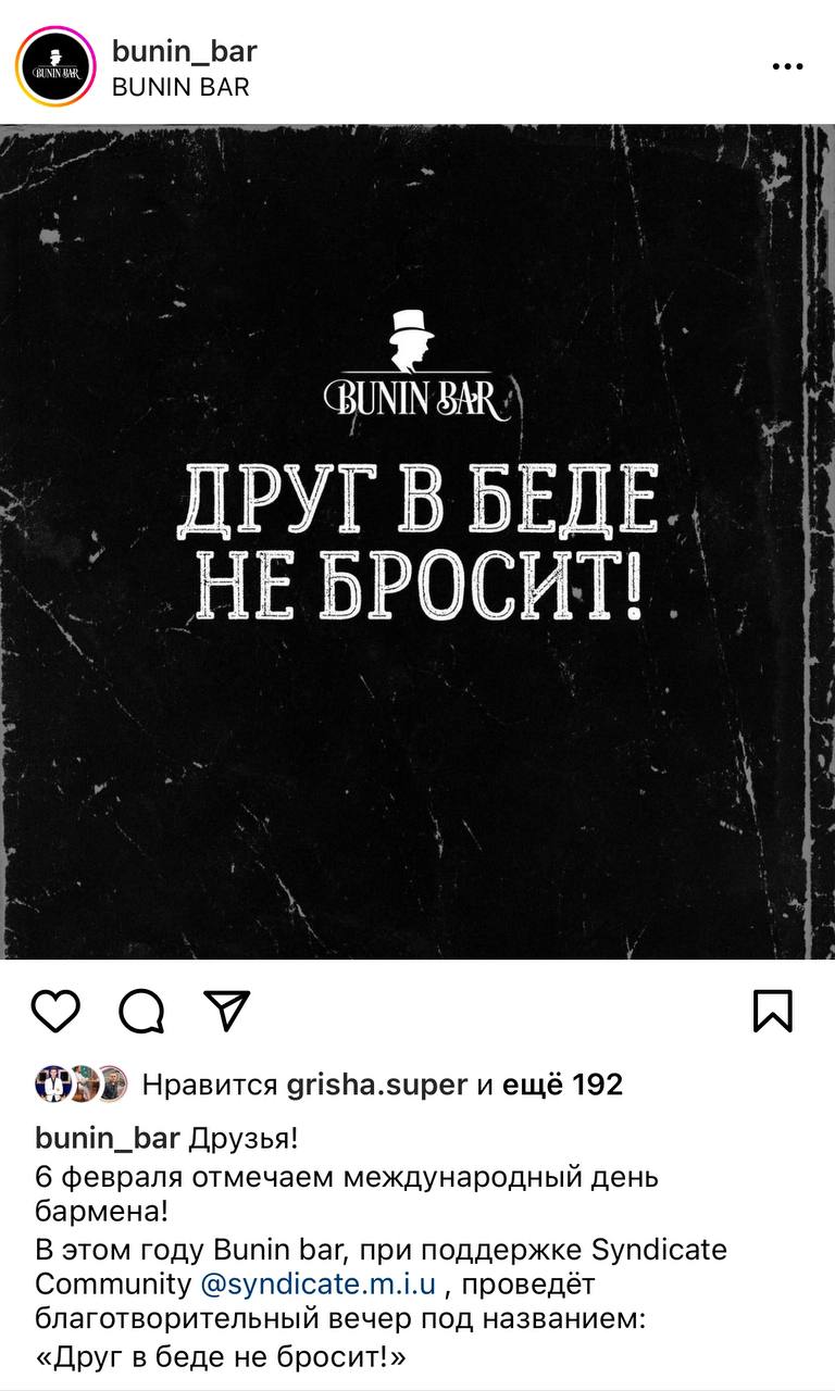 112 750 рублей во время акции «Друг в беде не бросит». Она прошла накануне в баре Bunin, где собрались представители негласного сообщества барменов, отметить свой профессиональный праздник. Бар, говорят, был битком. Все деньги от продажи коктейлей в этот вечер и ночь ушли на помощь брату екатеринбургского бармена Ильи Логинова Алексею, который нуждается в операции в Москве в НИИ Бурденко. На вечеринке были сомелье Sekta Тимур Саулебаев и легенда «Огонька» Евгений Кексин, который от бара внес 10000 рублей на сбор.