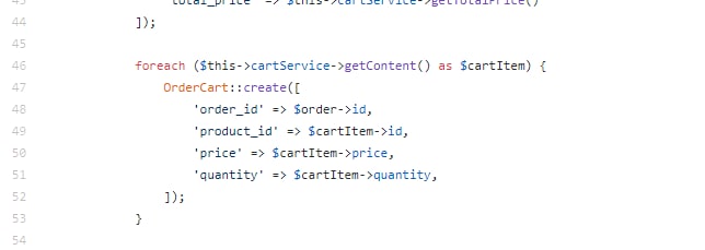 foreach ($this->cartService->getContent() as $cartItem) { OrderCart::create([ 'order_id' => $order->id, 'product_id' => $cartItem->id, 'price' => $cartItem->price, 'quantity' => $cartItem->quantity, ]); }foreach ($this->cartService->getContent() as $cartItem) {