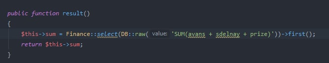 $this->sum = DB::select('SELECT avans, sdelnay, prize, (avans+sdelnay+prize) FROM finances'); return $this->sum; такой выводит данные, как его в ларавелевский запрос переписать?