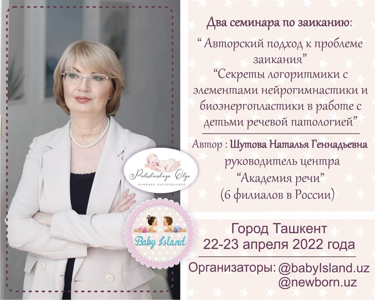 Автор семинара: Шутова Наталья Геннадьевна , руководитель Центра «Академия речи» (6 филиалов в России). Автор книги «Системная комплексная логоритмика в коррекции заикания у детей и взрослых» (в 2 частях), 2018 г. Мастер-класс Натальи Геннадьевны на Логофесте, который проходил в 2018г. в г.Москве, вызвал огромный интерес и отзывы коллег.