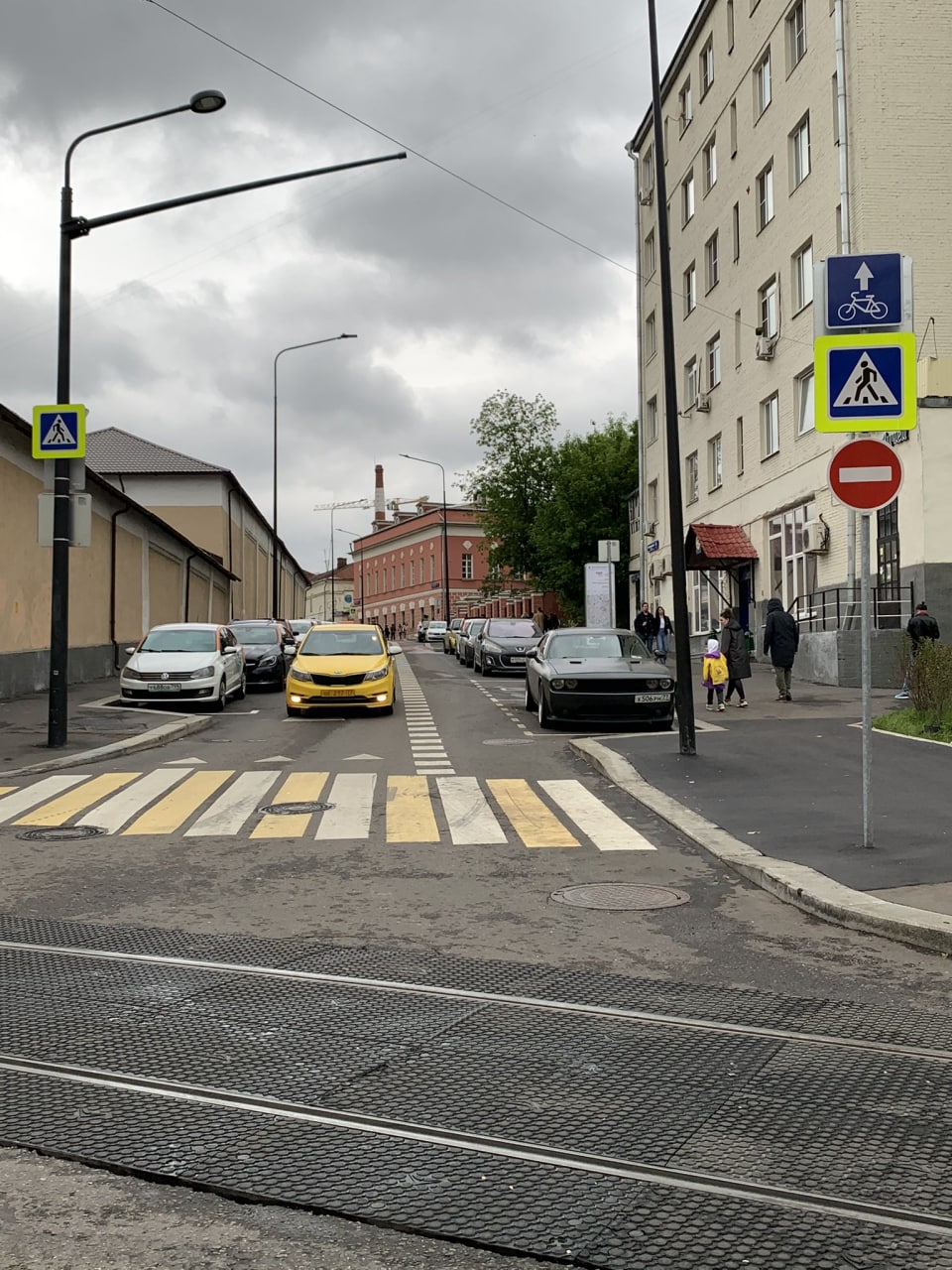 Почему она приходит в тротуар, который перед перекрёстком становится уже, да еще и заставлен антитеррористиескими блоками?
