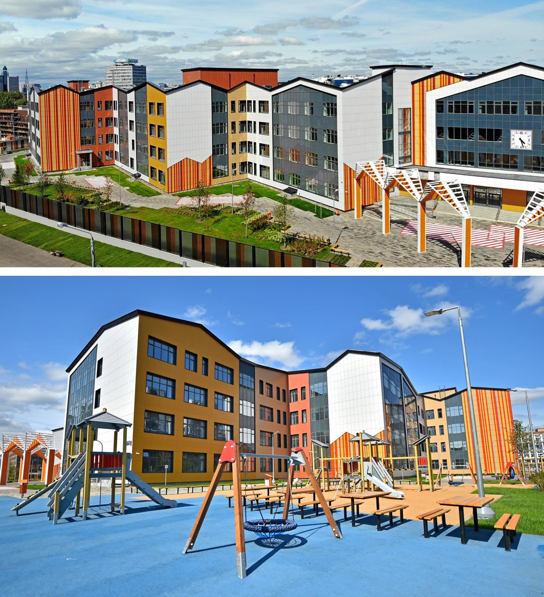 🏫 Здание построено по так называемой кампусной системе, популярной в Европе. Такие учебные учреждения еще называют учебным городом, городом в городе. Школа и похожа на городок из множества взаимосвязанных домиков с покатой крышей. Этот образ из голландской архитектуры перекликается с домами ЖК, облицованными клинкерным кирпичом.