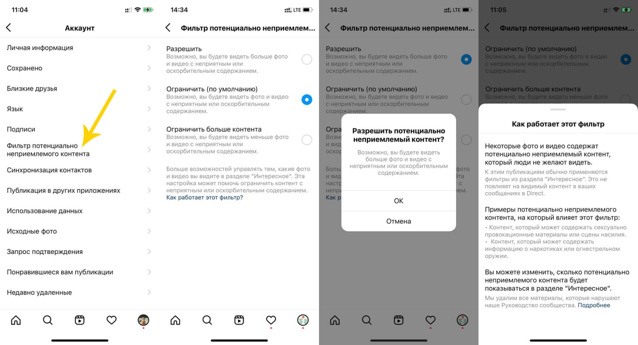 Ограничить — возможно, вы будете видеть фото и видео с неприятным или оскорбительным содержанием. Этот вариант установлен у всех по умолчанию.