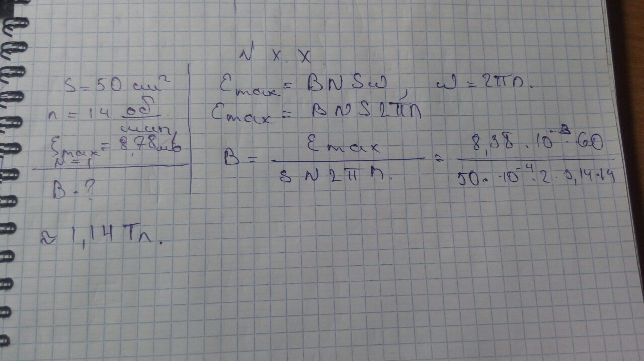 замкнутый контур в виде рамки с площадью 50 см2 равномерно вращается в магнитном поле делая 14 об/с при этом в контуре индуцируется максимальная эдс равная 8.78 мВ определить индукцию магнитного поля в котором вращается контур ось вращения контура перпендикулярна полю