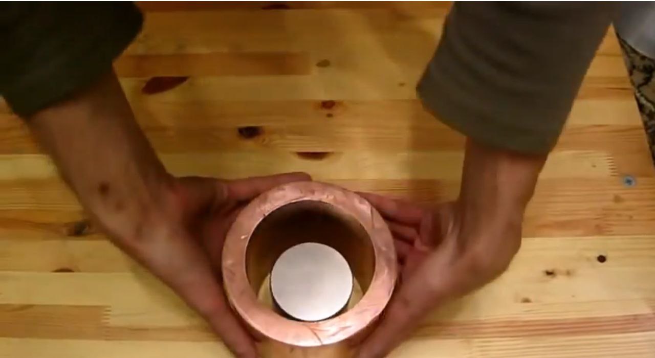 Когда магнит начинает падать в медную трубку, то резко повышается магнитный поток, в результате в трубке образуется ЭДС самоиндукции и соответствующие индукционные токи, которые порождают магнитное поле с противоположным направлением. В результате индуцированное поле тормозит магнит и падает он замедленно.