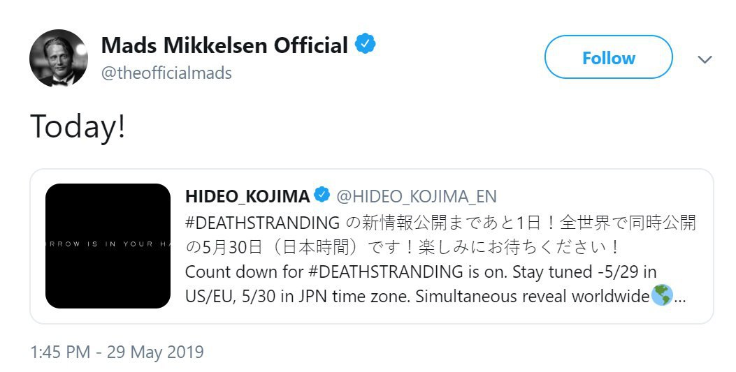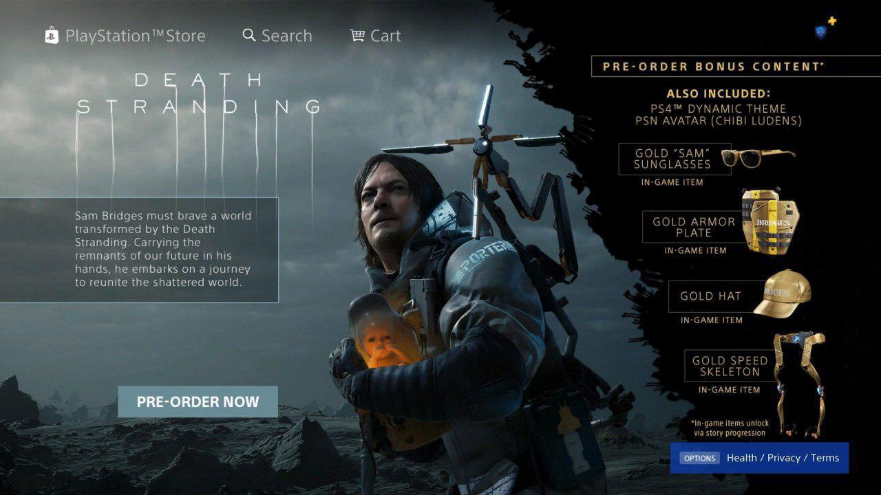 В PSN засветилась страница предзаказа Death Stranding с описанием сюжета игры: «Сэм Бриджес должен покорить мир, перекроенный Death Stranding (видимо, это название апокалиптического катаклизма). Неся в своих руках остатки нашего будущего (ребёнок?), он отправляется в путешествие, чтобы воссоединить расколотый мир».