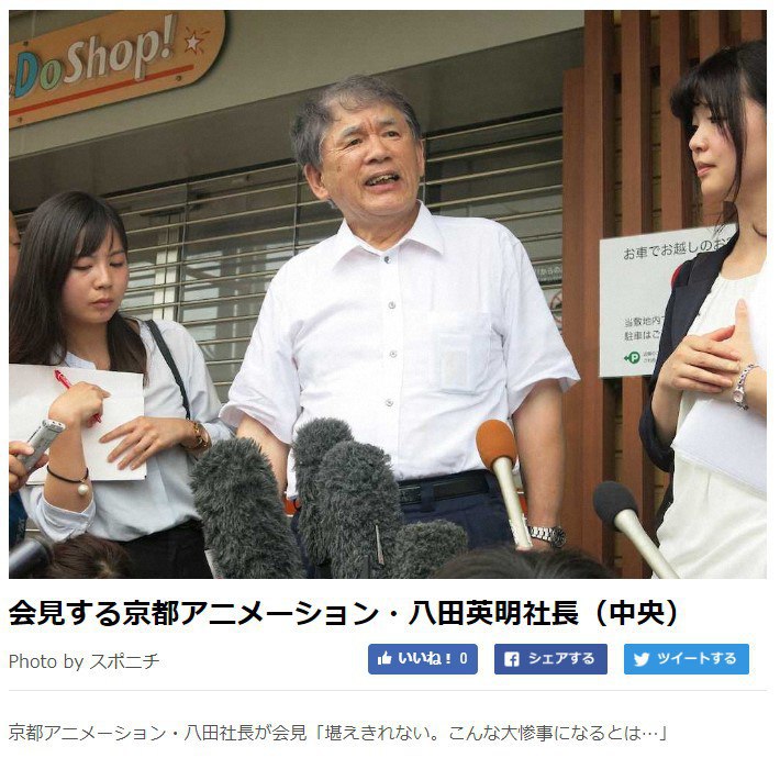 Напомним, что вчера утром в здании Kyoto Animations был устроен поджог. В результате погибло 33 человека, ещё 35 пострадало. Поджигатель был задержан полицией. Это самое крупное массовое убийство в Японии со времён Второй Мировой Войны.