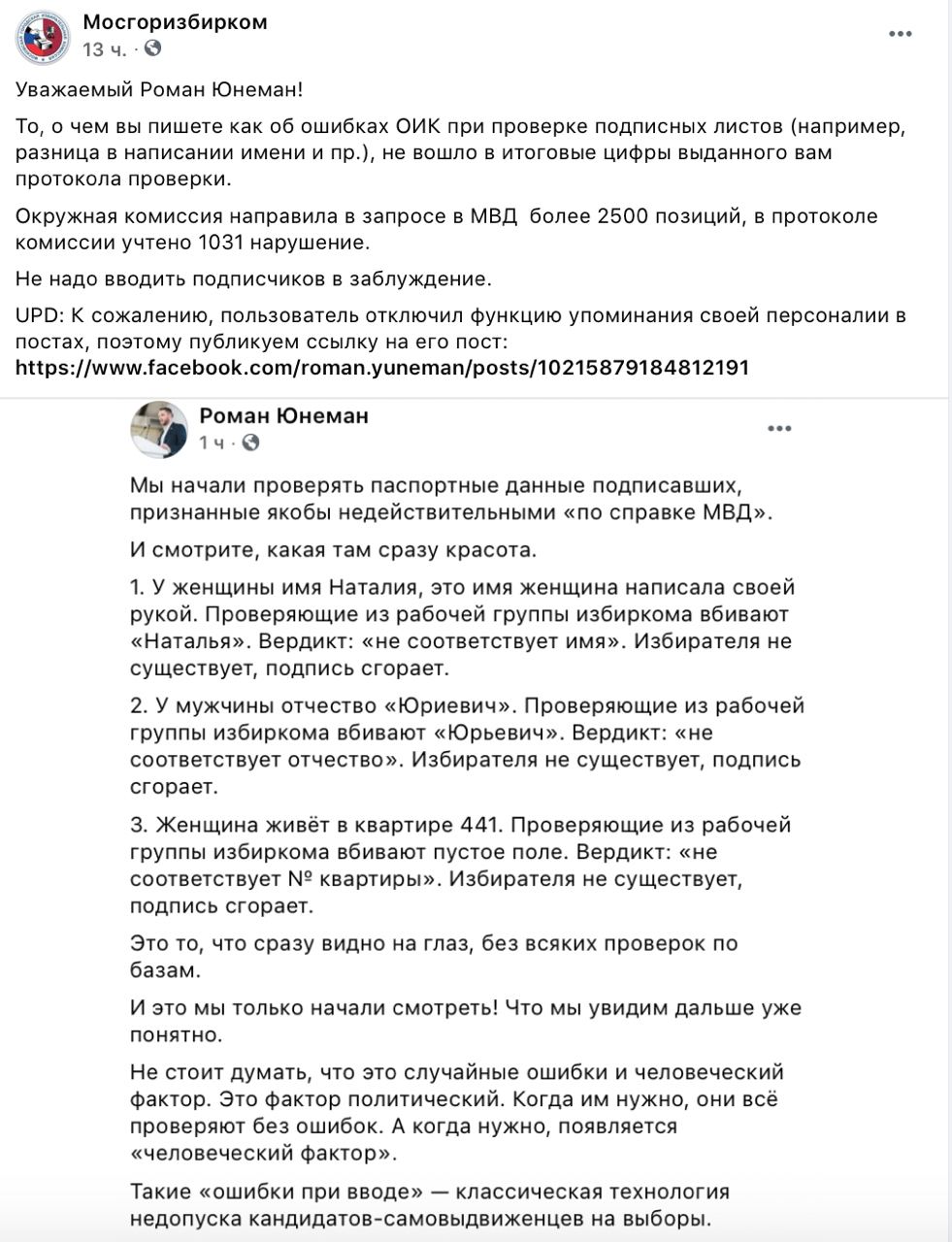Примечательно, что Юнеман дошел в своем вранье до того, что даже заблокировал аккаунт Мосгоризбиркома в Facebook, чтобы его нельзя было отметить гиперссылкой в тексте, проясняющим ситуацию. Политик, очевидно, не заинтересован в том, чтобы его сторонники знали о реальных ошибках, которые были допущены при сборе подписей и продолжал верить в то, что во всем виновата власть, которая якобы очень боится его участия в кампании.