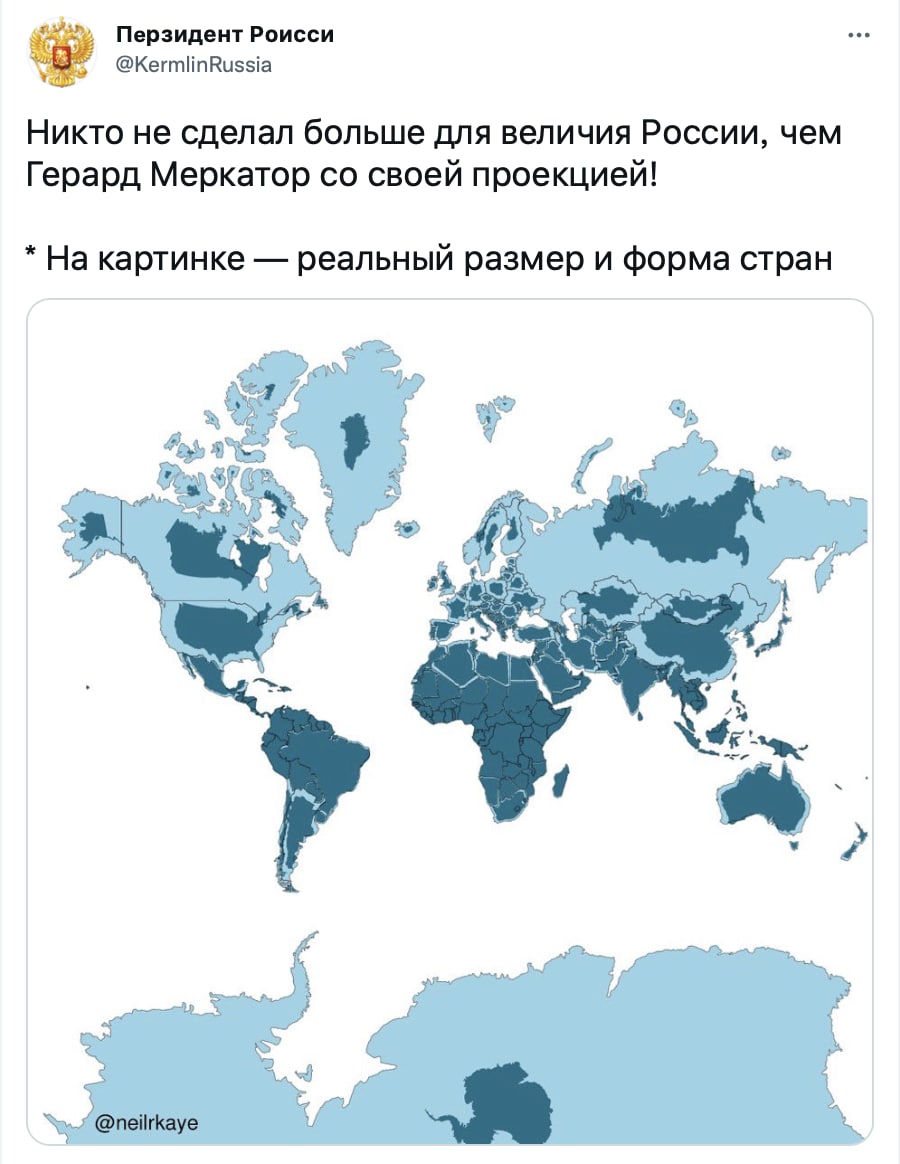 "миф" о гигантской территории России берет свое начало из неверно отображающей размеры территорий стран карты с использованием проекции Меркатора, которая сохраняет реальные расстояния только на экваторе, все больше искажая размеры по мере продвижения к полюсам.