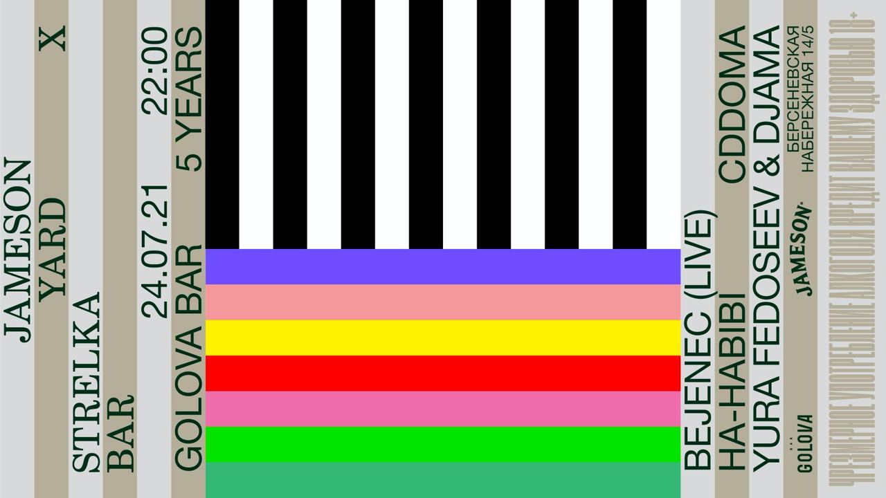 пятилетие бара «Голова». В программе — бассейн с блёстками, конкурс «напейся-не-облейся», back-to-back Юры Федосеева с Джамой, трио Ha-Habibi с новой порцией неотразимого звукового рахат-лукума, CDDOMA и лайв-сет артиста, известного как Bejenec: украинского продюсера Даниила Сеничкина, принципиально выступающего только живьём.