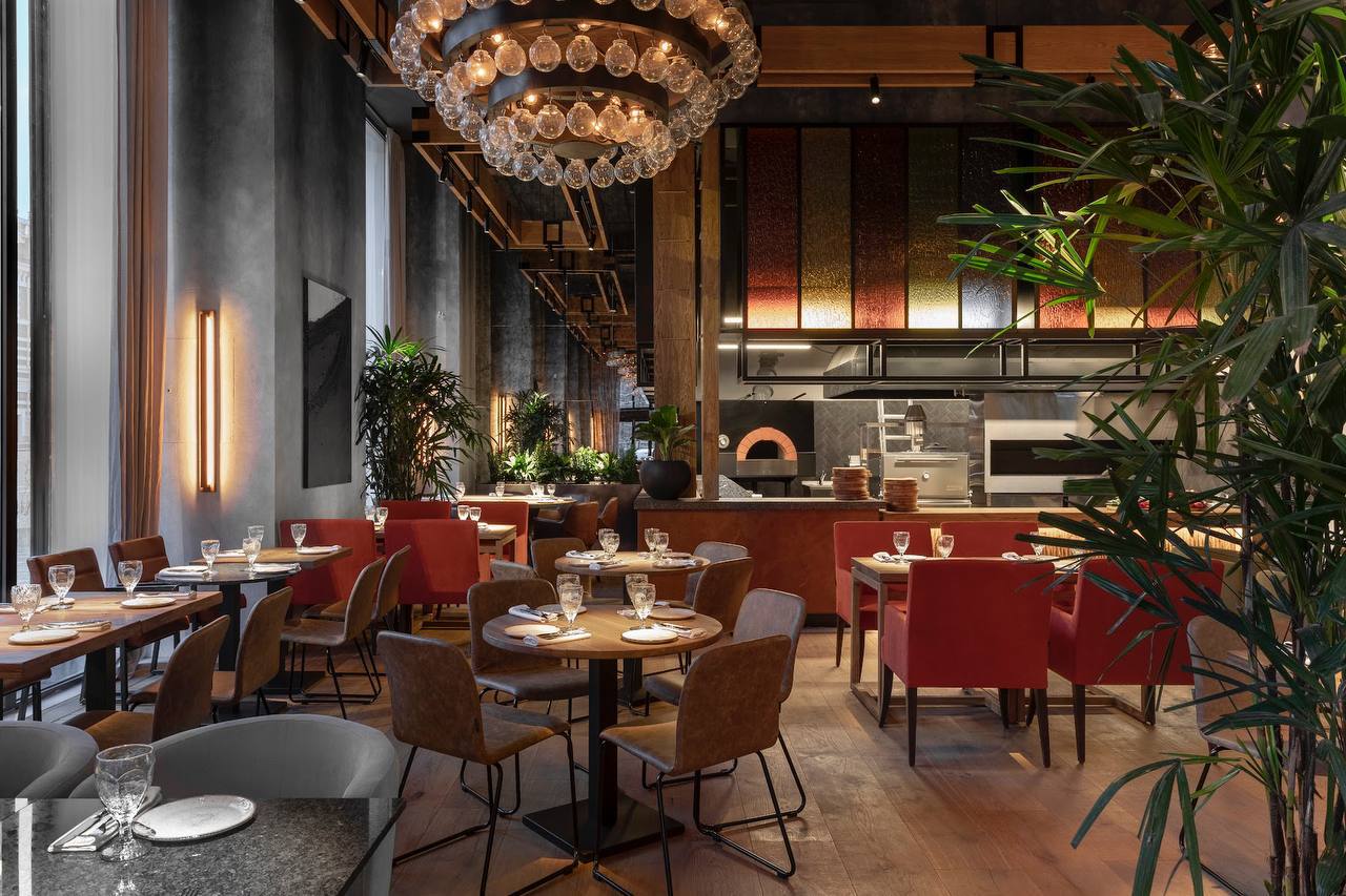 Общий стол на 12-14 человек подойдет большим компаниям, но готов объединить и незнакомцев. Мягкая зона с плавно изогнутым диваном ждет тех, кто хочет провести время за общей беседой. Столики на двоих, встроенные в стену, готовы принять романтические парочки, сохранив их беседы от чужих ушей. Устроенные в оконных проемах кушетки обеспечат приватность мечтателям, достаточно лишь задернуть завесу из французской мережки. При этом почти у каждого столика есть розетки, а значит и поработать недолго здесь тоже можно.