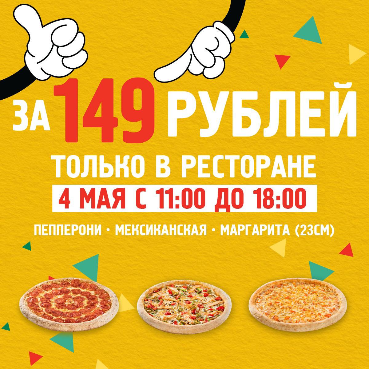 Сегодня с 11:00 до 18:00 при заказе в ресторанах Папа Джонс цена на пиццы диаметром 23 см из списка: Пепперони, Мексиканская или Маргарита — ВСЕГО 149 рублей!