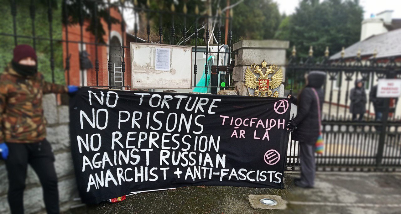 «Делом Сети» у посольства России в Дублине (Ирландия)В субботу, 22 февраля, возле посольства России в Дублине, (Ирландия), прошла акция протеста в знак солидарности с преследуемыми анархистами и антифашистами со стороны российского государства. В своём
