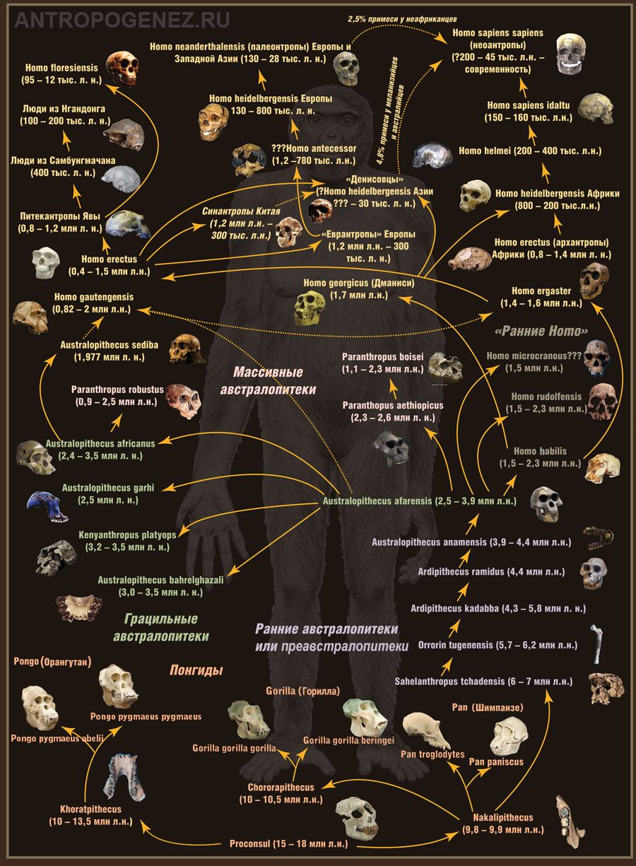 Внимательный читатель заметит, что находок в промежутке 1-0.1 млн лет у нас почти нет, пять штук, при том что за последующие миллионы десятки и сотни черепов в каждом