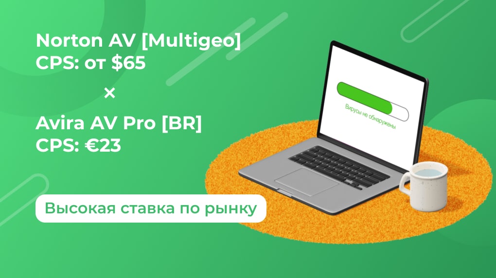Оплата по офферам начисляется за приобретение пакета антивирусного ПО: от $65 на Norton AV и €23 на Avira AV Pro. Ставки — выше некуда!🔥