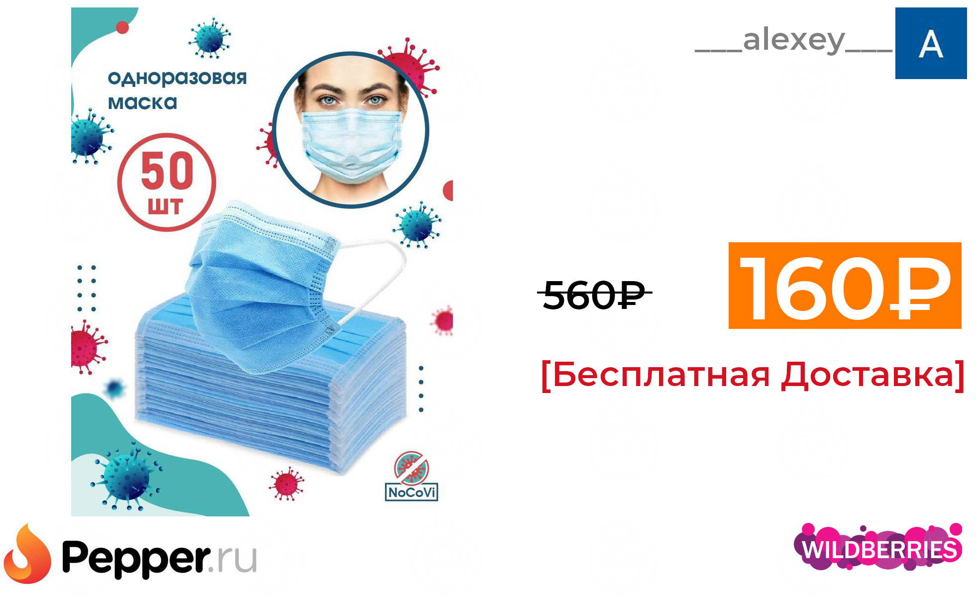 🔹Одноразовые маски для лица / Трехслойные маски с фиксатором для носа (50шт.), NoCoVi 160₽ ❗️🔥(везде от 560₽)