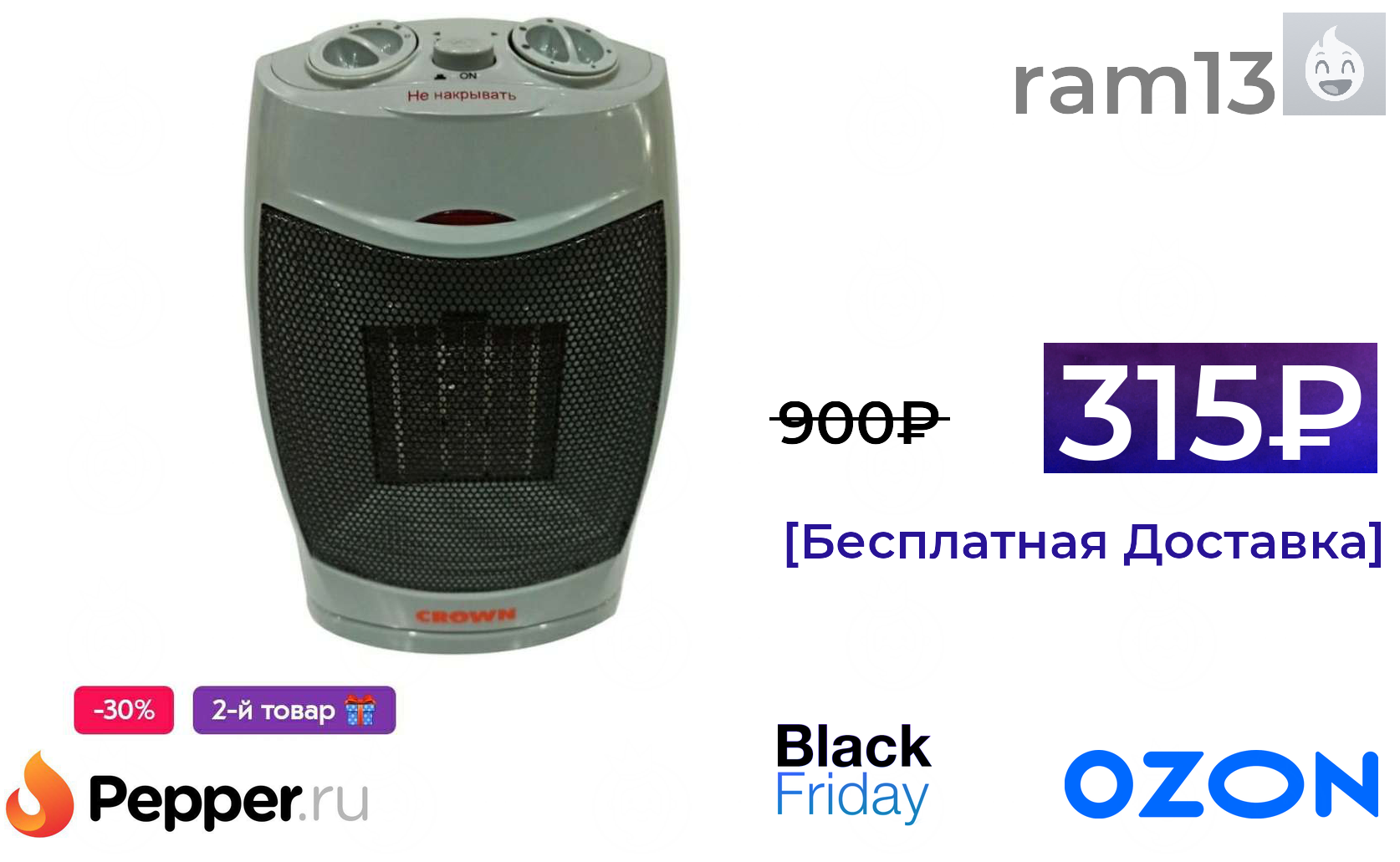 🔹Обогреватель керамический CROWN PTC-902 при покупке 2шт 315₽ ❗️🔥(везде от 900₽)