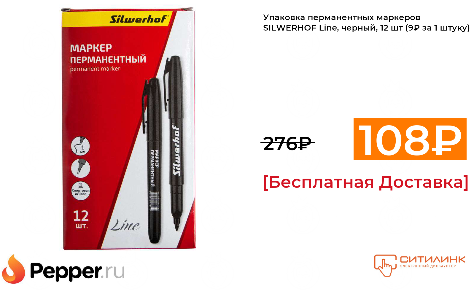 🔹Упаковка перманентных маркеров SILWERHOF Line, черный, 12 шт (9₽ за 1 штуку) ❗️🔥(везде от 276₽)