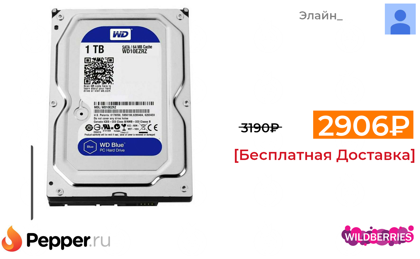 🔹Жёсткий диск HDD 1ТБ WD Blue (WD10EZRZ) 2906₽ ❗️🔥(везде от 3190₽)
