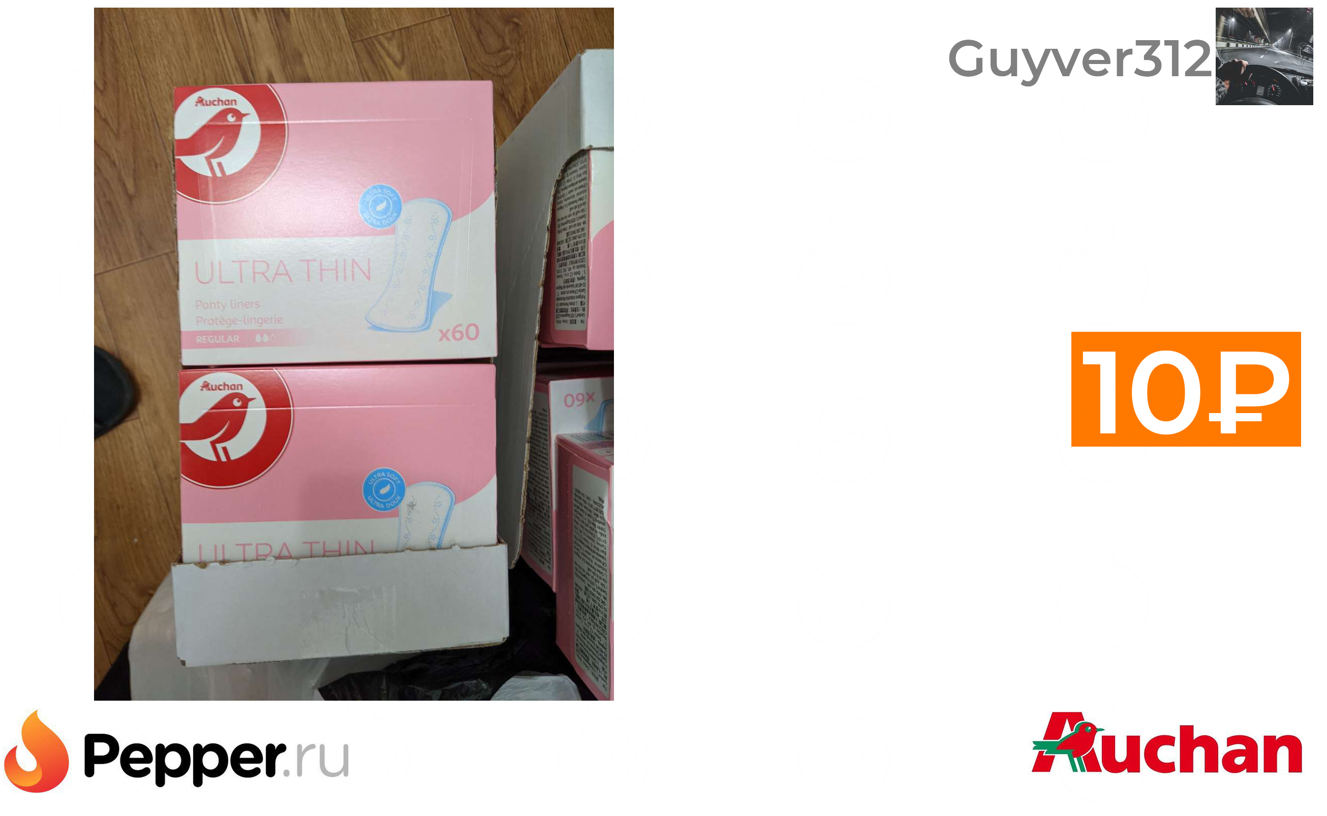 🔹[Воронеж] Прокладки ежедневные Auchan UltraSoft Ultra Thin Regular, 60 шт. 10₽ ❗️🔥