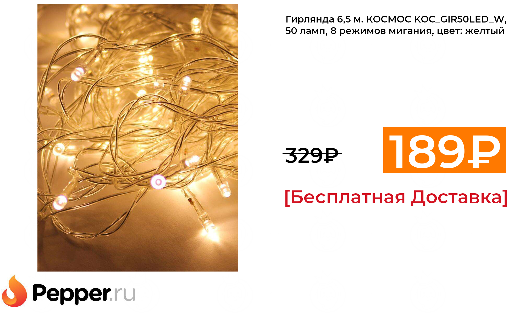 🔹Гирлянда 6,5 м. КОСМОС KOC_GIR50LED_W, 50 ламп, 8 режимов мигания, цвет: желтый 189₽ ❗️🔥(везде от 329₽)