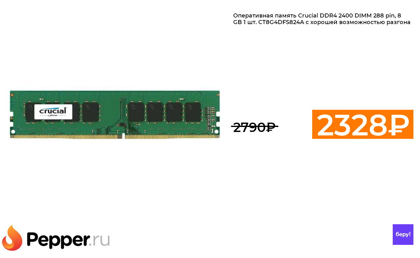 🔹Оперативная память Crucial DDR4 2400 DIMM 288 pin, 8 GB 1 шт. CT8G4DFS824A с хорошей возможностью разгона 2328₽ ❗️🔥(везде от 2790₽)