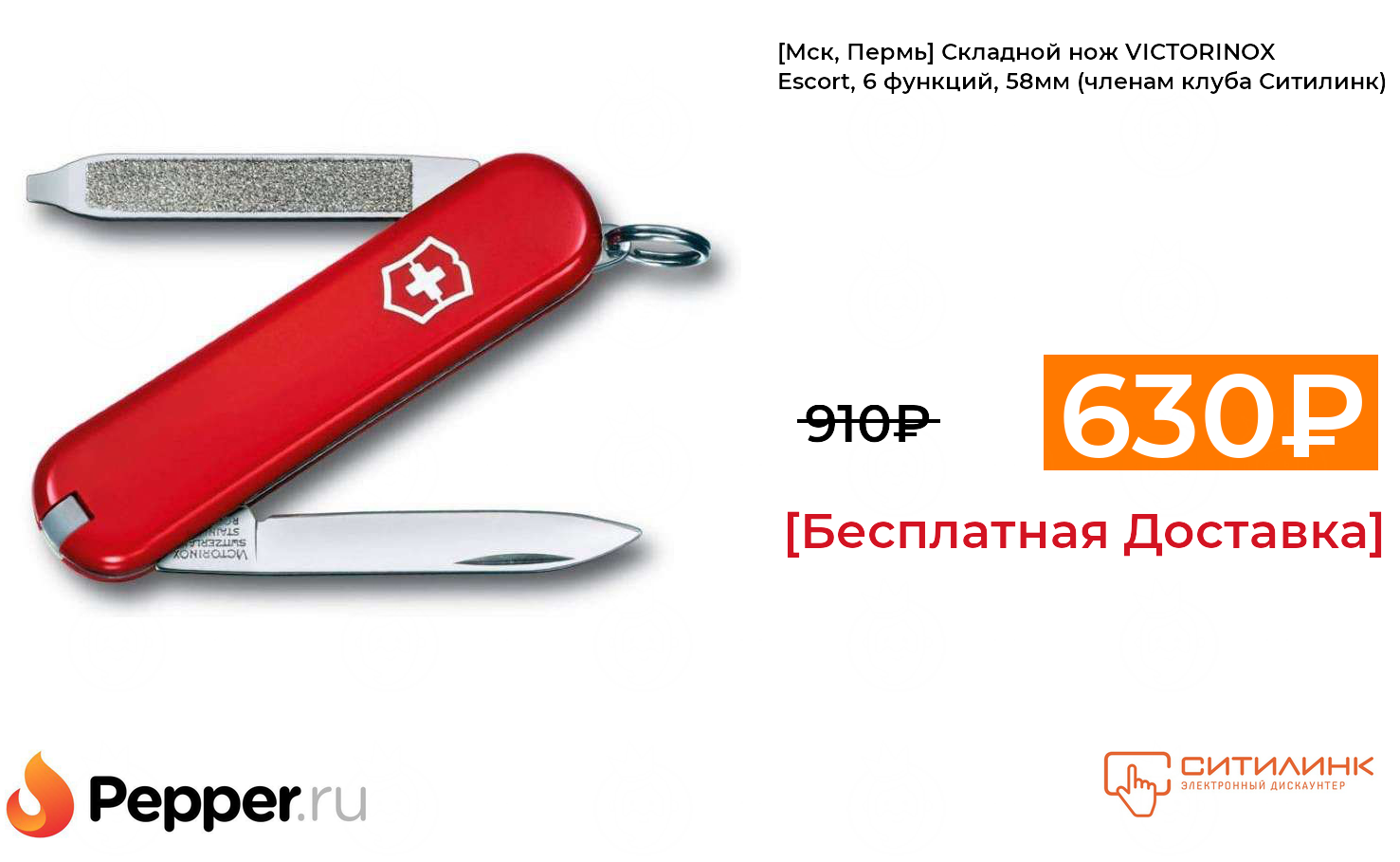 🔹[Мск, Пермь] Складной нож VICTORINOX Escort, 6 функций, 58мм (членам клуба Ситилинк) 630₽ ❗️🔥(везде от 910₽)