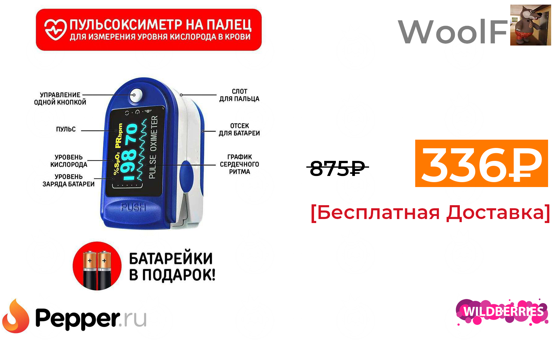 🔹Пульсоксиметр OM-01, батарейки и шнурок в подарок 336₽ ❗️🔥(везде от 875₽)
