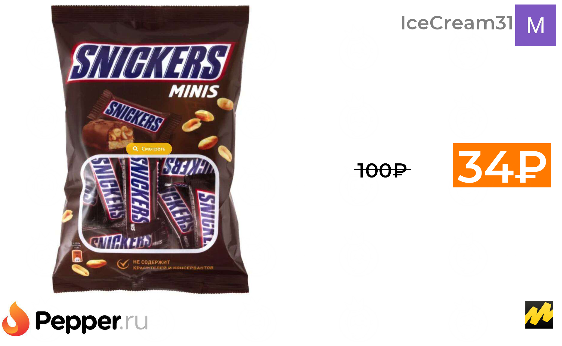 🔹Скидки на продукты питания (например, конфеты Snickers minis, 180 г) 34₽ ❗️🔥(везде от 100₽)