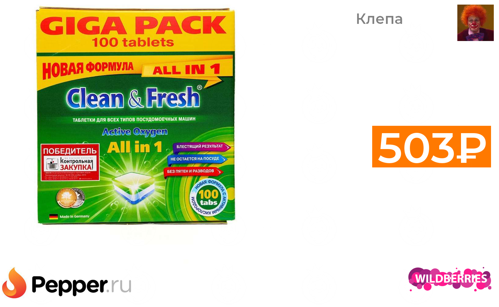 🔹Clean & Fresh All in 1 таблетки для посудомоечной машины, 100 шт. 503₽ ❗️🔥