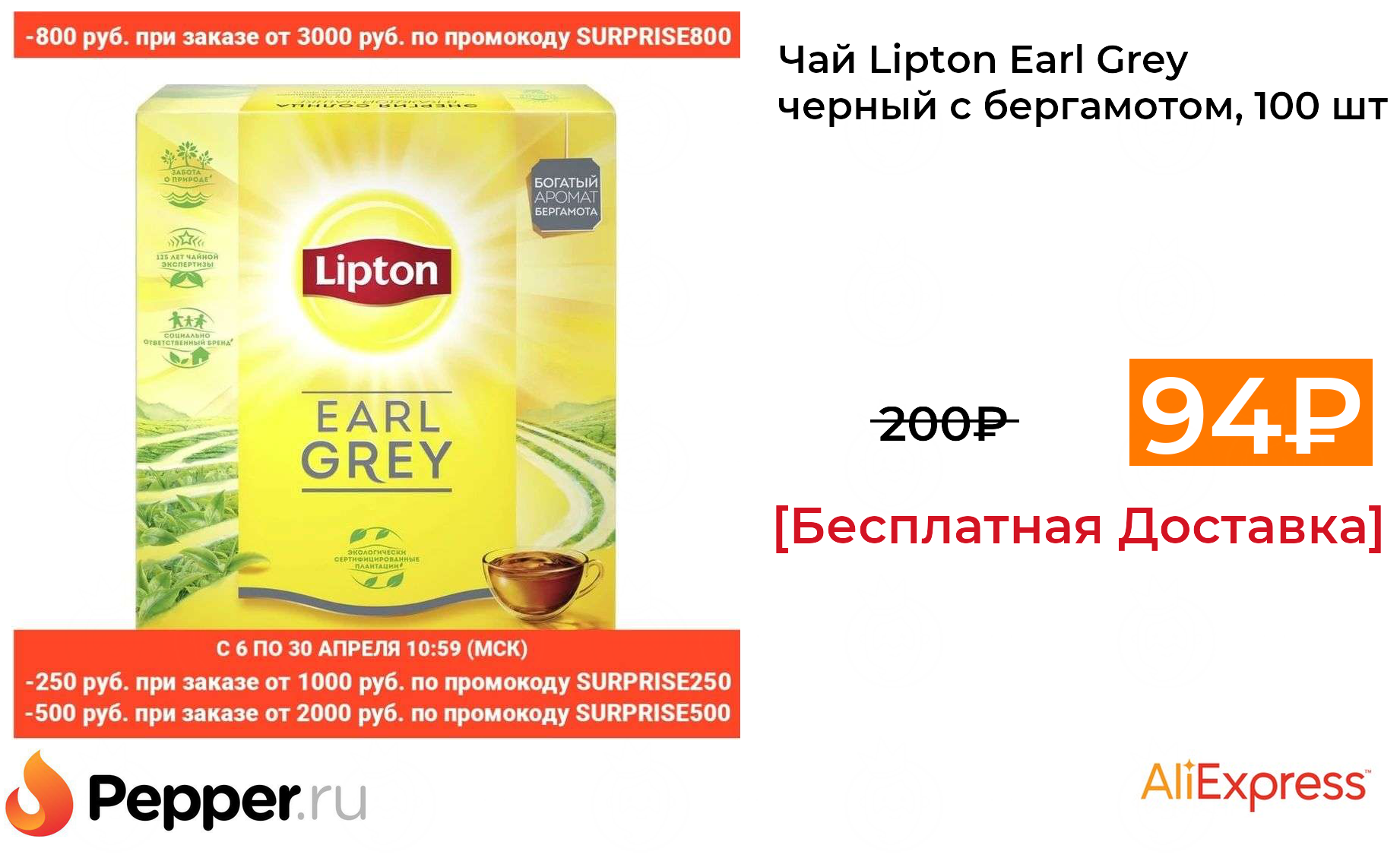 🔹Чай Lipton Earl Grey черный с бергамотом, 100 шт 94₽ ❗️🔥(везде от 200₽)