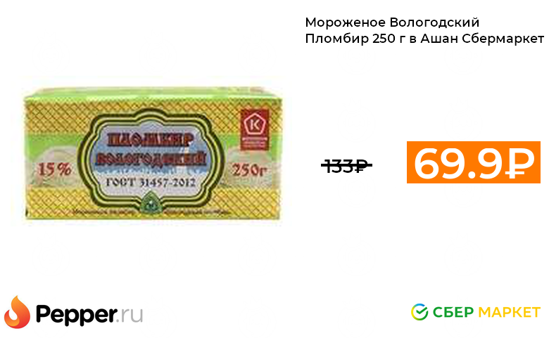 🔹Мороженое Вологодский Пломбир 250 г в Ашан Сбермаркет 69.99₽ ❗️🔥(везде от 133₽)