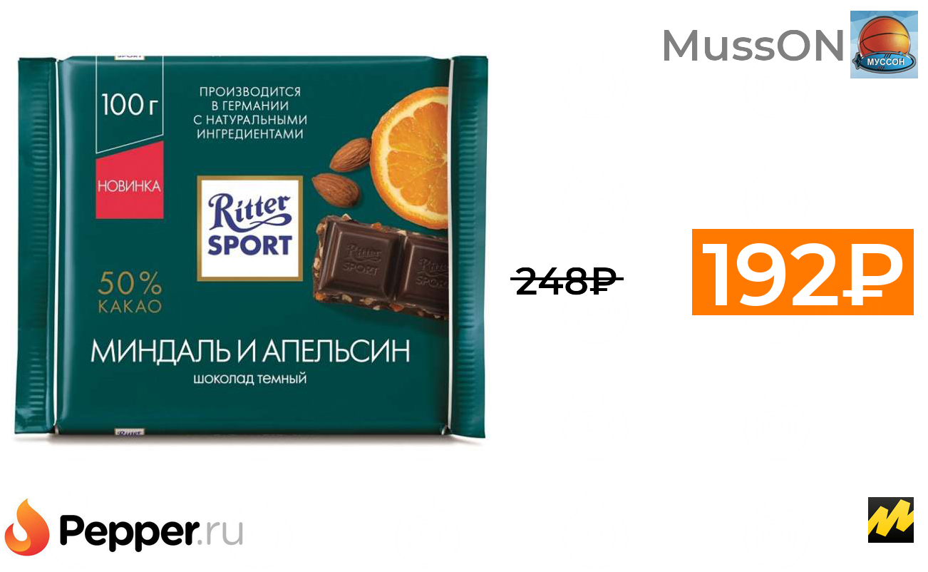 🔹Шоколад Ritter Sport Миндаль и апельсин темный 50% какао 4 шт. 192₽ ❗️🔥(везде от 248₽)