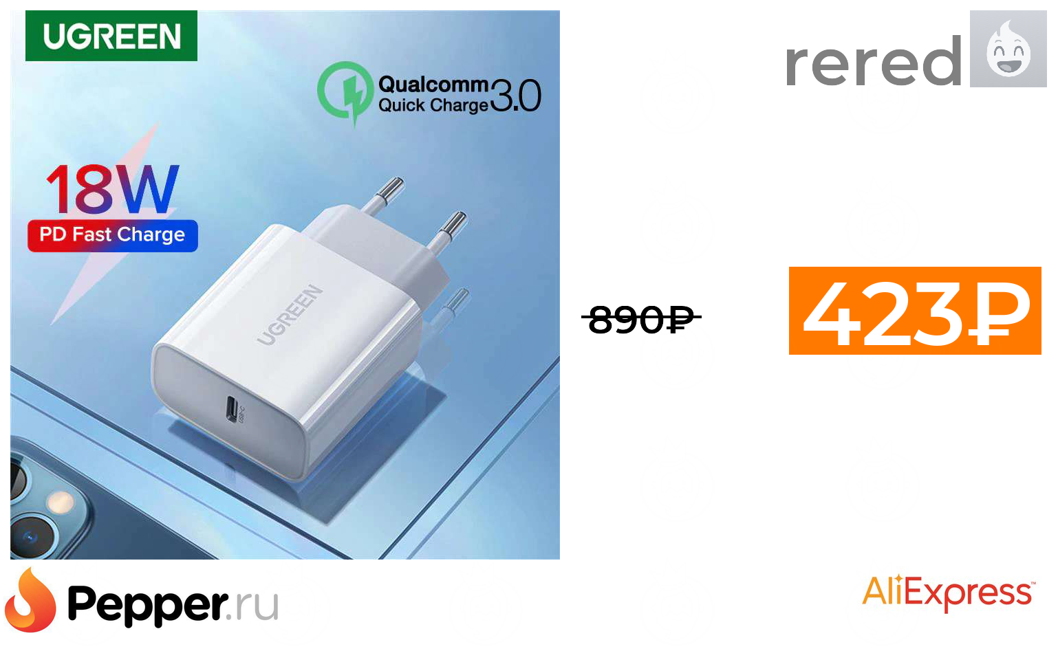 🔹Быстрая зарядка Ugreen USB Type-C QC 3.0 18 Вт 423₽ ❗️🔥(везде от 890₽)