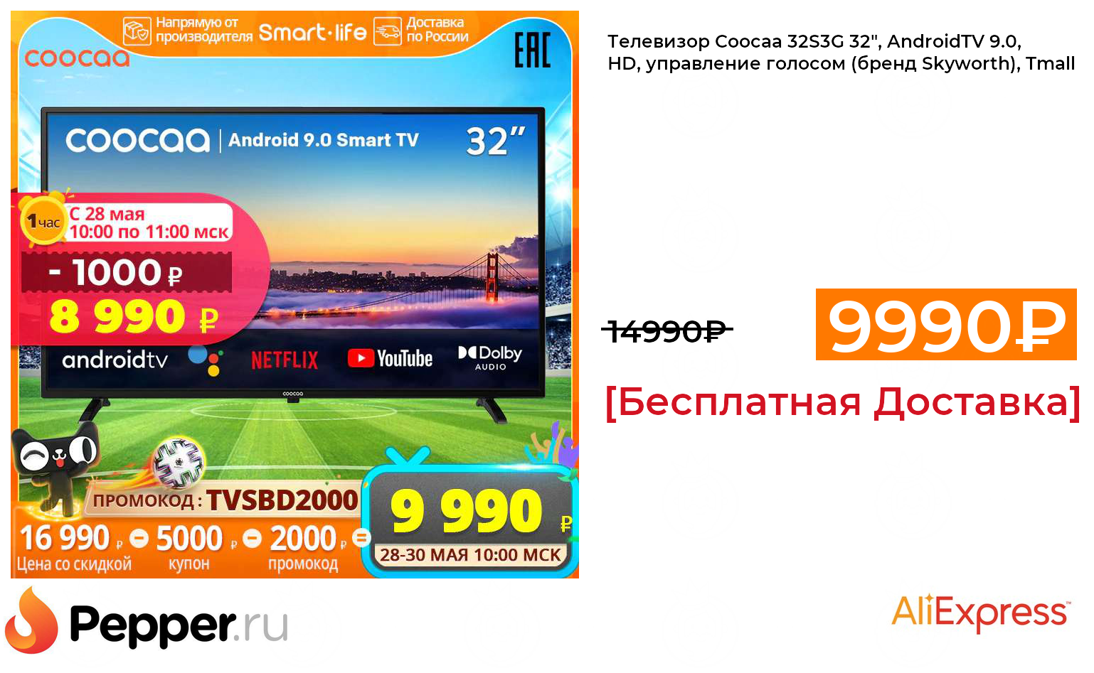 🔹Телевизор Coocaa 32S3G 32", AndroidTV 9.0, HD, управление голосом (бренд Skyworth), Tmall 9990₽ ❗️🔥(везде от 14990₽)