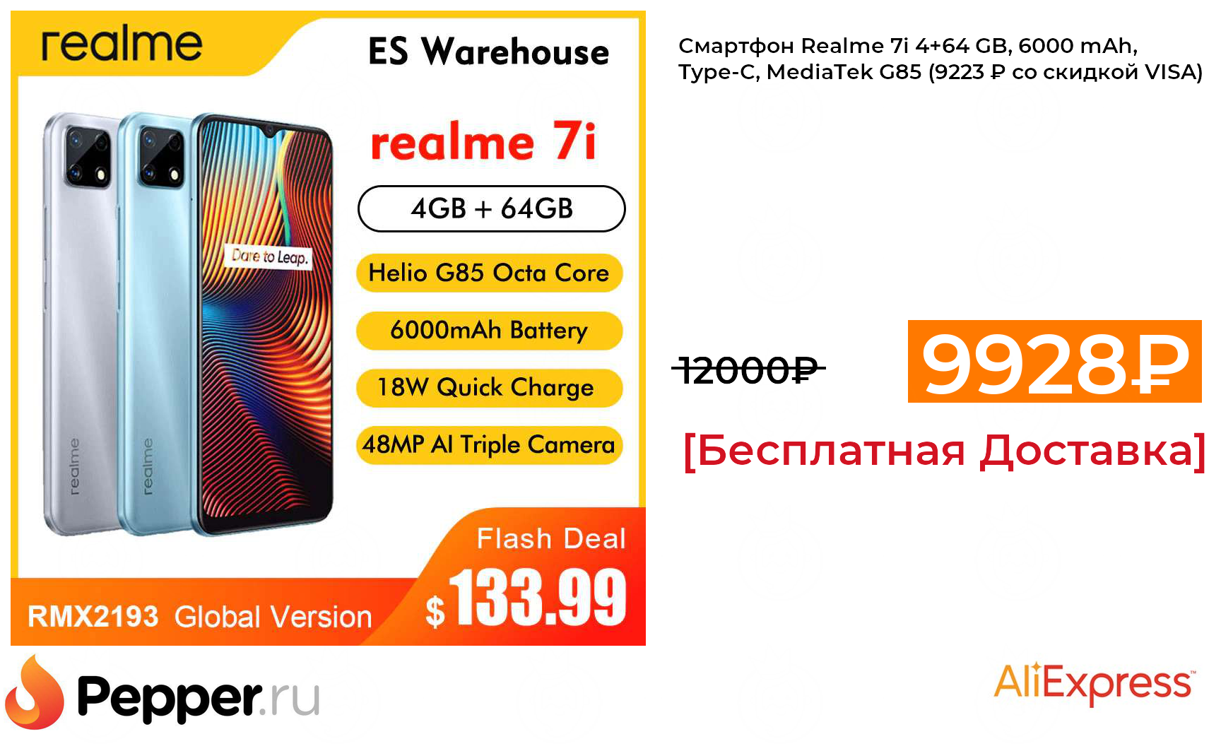 🔹Смартфон Realme 7i 4+64 GB, 6000 mAh, Type-C, MediaTek G85 (9223 ₽ со скидкой VISA) ❗️🔥(везде от 12000₽)