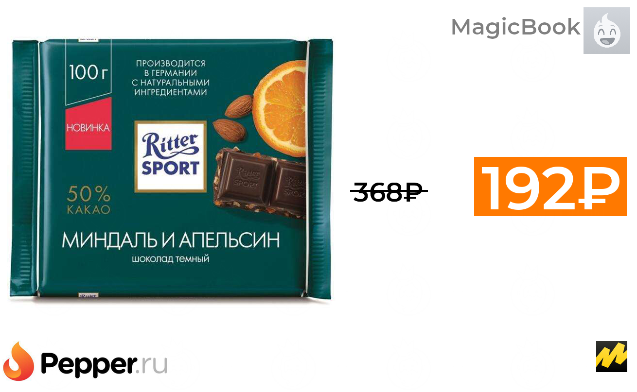 🔹Шоколад Ritter Sport "Миндаль и апельсин" темный, 100 г 4 упаковки (48₽ за шт.) ❗️🔥(везде от 368₽)