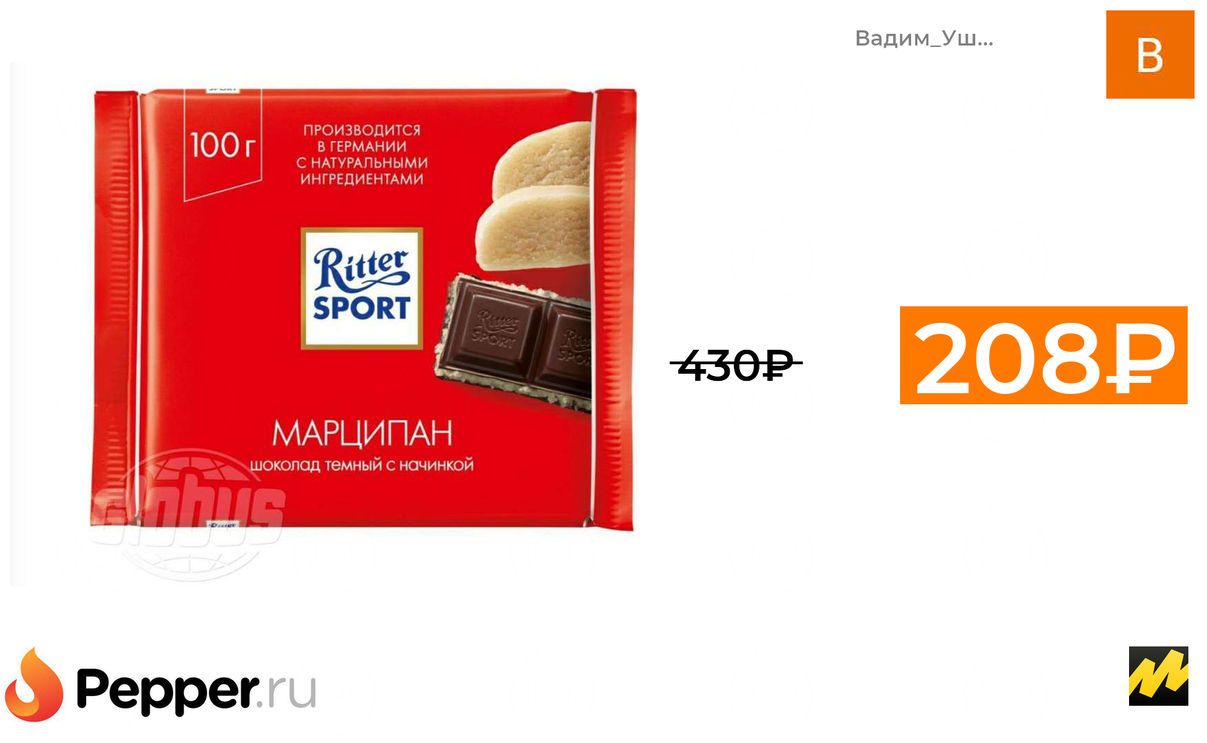 🔹Шоколад тёмный Ritter Sport с начинкой Марципан, 100 г (4 штуки, цена за 1 штуку 52 рубля) 208₽ ❗️🔥(везде от 430₽)