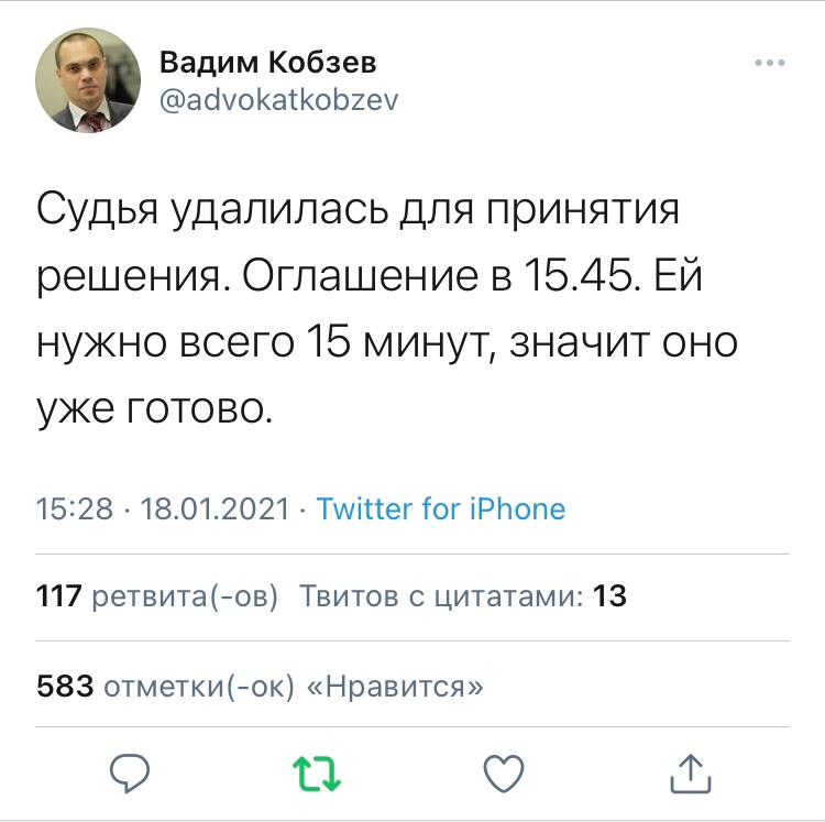 Адвокат Навального пишет из ОВД Химок, где проходит заседание по мере пресечения (не в суде, а в отделе полиции суд, ага), что судья ушла для принятия решения (неясно куда, совещательная комната-то в ОВД не предусмотрена)