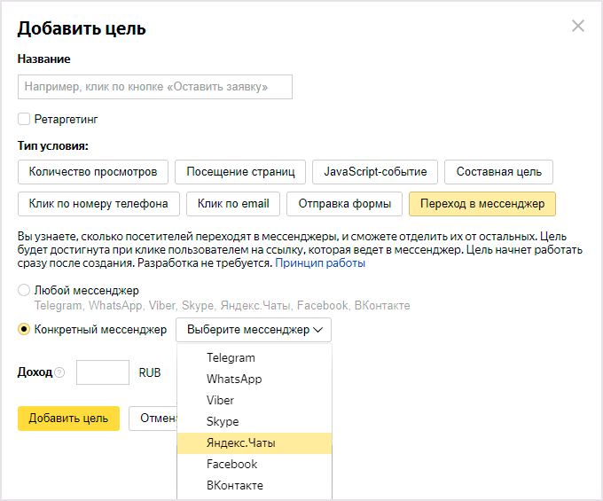 Если на сайте есть несколько мессенджеров, необходимо завести по отдельной цели на каждый, и одну общую цель на переход в любой мессенджер.