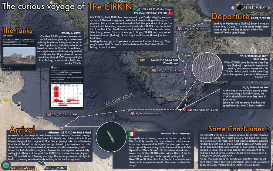 28 мая 2020 года CIRKIN прибыл в порт Мисраты — на следующий день в социальных сетях появились фотографии транспортировки тяжёлой военной техники из Мисраты в Триполи: пользователи узнали танки М60. Маршрут судна был изменён — вместо привычного огибания острова Крит с запада через греческие территориальные воды, CIRKIN проследовал в сопровождении турецкого фрегата восточнее о.Крит.