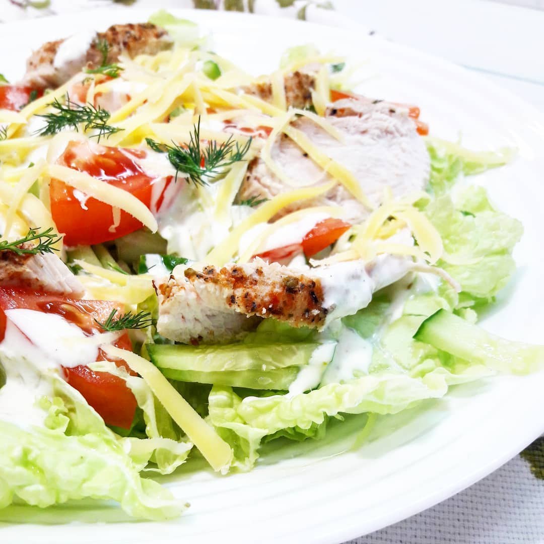5. Кубики куриного филе и твердого сыра, тертый свежий огурец, зубчик чеснока, сметана.
