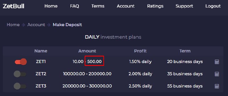 ZetBull - Среднедоходный проект на лецинзионном GoldCoders скрипте, от Легендарной, опытной зарубежной администрации, прошлые проекты такие как - Comex Trades, BSfinance, Der Global и другие. В проекте на данный момент имеется всего один рабочий, актуальный тарифный план с доходностью в 1.5% в сутки на 20 рабочих дней (Итого 30% чистыми).