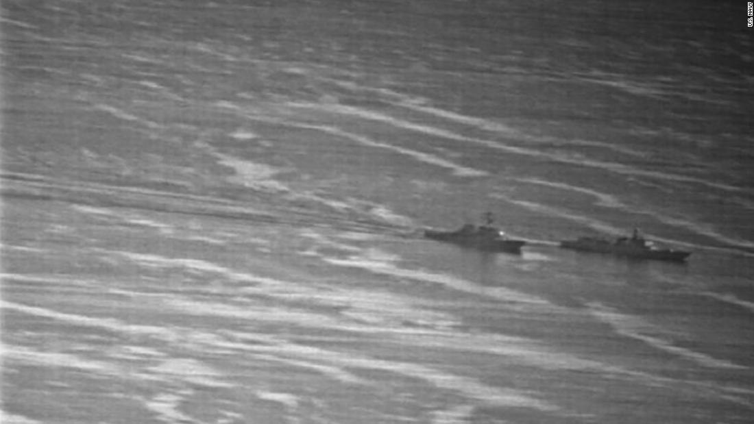 Аэрофотоснимки, сделанные ВМС США, показывают, как корабль ВМФ США чуть не столкнулся с китайским военным кораблем, китайцы бросили вызов присутствию американского судна в Южно-Китайском море.